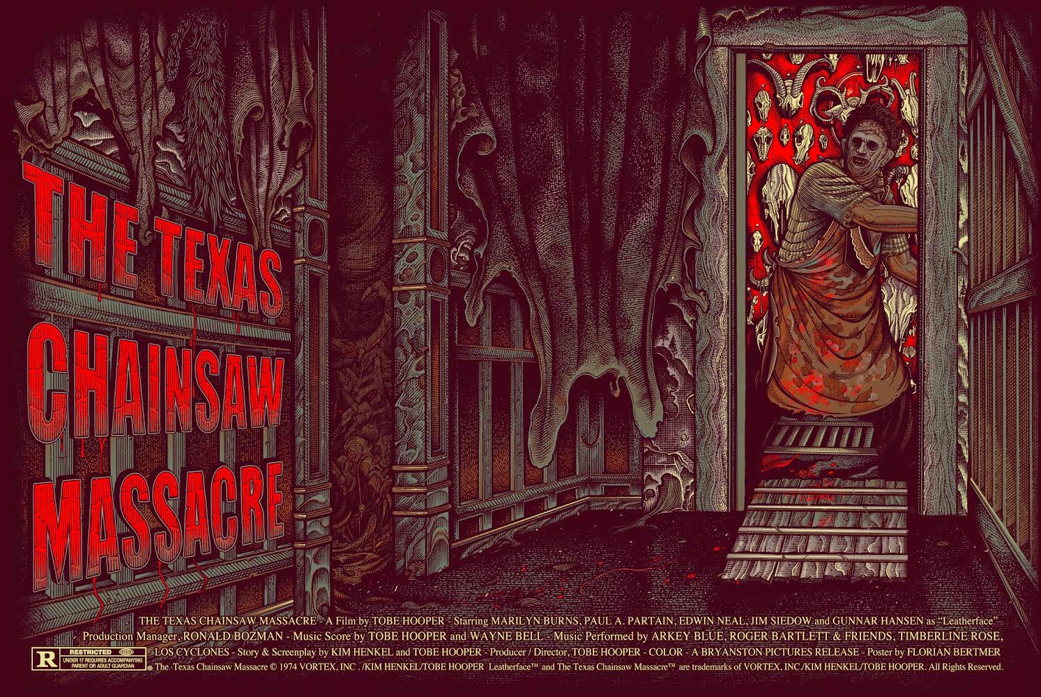 "When I was asked to come up with an idea for Texas Chainsaw, I knew right away I wasn't going to draw Leatherface with a chainsaw because frankly, it has been done a million times. When I re-watched the movie I kept going back to the scene of Kirk entering the house - the moment you see the red room at the end of the hall with the trophies on the wall is just so creepy and scary. I love the amount of detail they put into the house with the animal hides and Ed Gein bone sculptures, it really sells the movie for me and I tried to capture the gruesome details in my drawing.I decided to show Leatherface after he dragged Kirk out of sight about to slam the door shut because this scene is the downright scariest scene of the movie. Hope you like it". Florian-