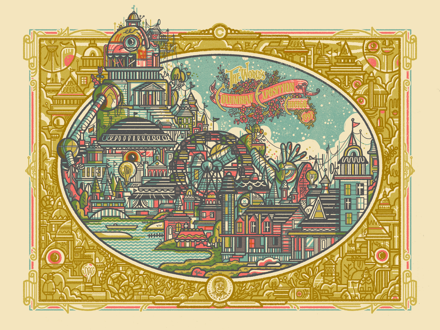 Illustrator Drew Millward knocked out this impressively detailed art print themed on the World's Fair Columbian Exposition that was held in Chicago 1893. Mimicking travel poster aesthetics, Millward elevates the design with intricate details and eye popping colors to keep the eye actively scanning this beautiful image. The 19th century drive towards progress and the mechanical age is playfully integrated through a "deus ex machina" looking over the fair.