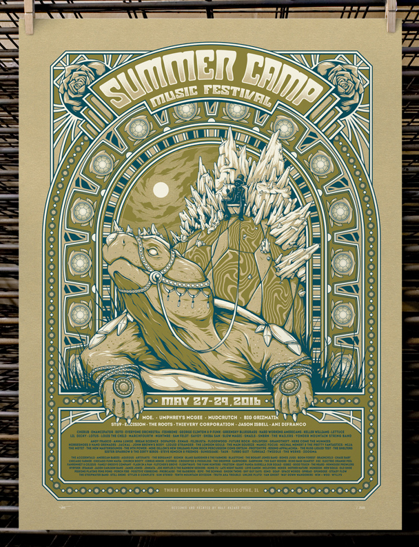 The second is the VIP posters for Summer Camp Music festival in Chillicothe, IL. This is an 18”x24”, 3-color screen print with an AP edition of 30 available, original run of 2500. They also have a variant available on metallic, gold leaf paper with an edition of 30. The standard run are $50 each, and the variants are $60.